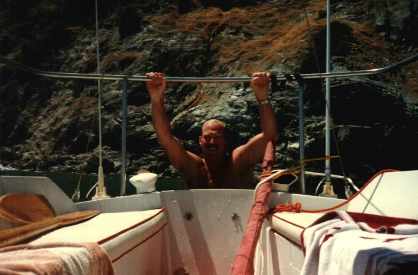 My dad, Tom Oyan, hanging off of his sailboat in the waters of Catalina island